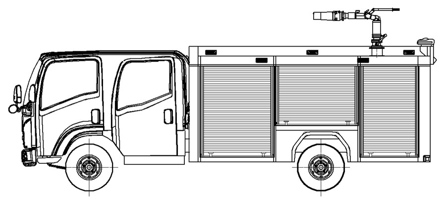 整車由消防員乘員室和車身兩大部分組成,車身布置采用內藏罐式結構,左右兩側為器材箱,中部為水罐,器材箱后部為泵房。 |