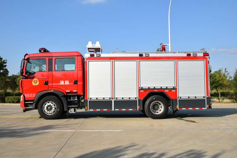 我公司生產(chǎn)的T5G單橋城市主戰(zhàn)消防車采用中國重汽集團(tuán)濟(jì)南卡車股份有限公司生產(chǎn)的ZZ5207TXFV471GF5型二類汽車底盤, 該車原裝雙排駕駛室,可載含駕駛員在內(nèi)的乘員6人,駕乘舒適輕便。該車采用DC-CAFS60/45M型集成壓縮空氣泡沫滅火系統(tǒng),該壓縮空氣泡沫系統(tǒng)操控簡易,泡沫生成實(shí)現(xiàn)即時(shí)全自動(dòng)微機(jī)精確調(diào)控,并設(shè)多重保護(hù)與報(bào)警系統(tǒng),消防作戰(zhàn)員可依據(jù)復(fù)雜的火場(chǎng)情況,方便地借助按鈕選擇干泡沫、濕泡沫等不同類型的泡沫滅火方式。該套系統(tǒng)不僅裝有A類泡沫原液,還裝有B類泡沫原液,可高效率地?fù)錅绾涂刂艫、B類物質(zhì)火災(zāi),并具備良好的環(huán)保性能。另外該車配置有牽引電動(dòng)絞盤,7.6米氣動(dòng)升降舉升4*1000w照明燈和10.5kw車載發(fā)電機(jī),使得該車還可獨(dú)立開展偵查、破拆、救生、照明、防護(hù)等綜合搶險(xiǎn)救援功能。